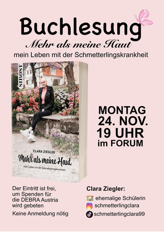 Clara Ziegler, ehemalige Schülerin am Gymnasium (Abitur 2019), hat ihr erstes Buch "Mehr als meine Haut" geschrieben. Sie arbeitet heute im Social Media-Bereich und klärt auf Instagram (schmetterlingclara) und TikTok (schmetterlingclara99) erfolgreich über ihre seltene Schmetterlingskrankheit Epidermolysis bullosa auf. Am Montag, den 24. November, liest sie ab 19 Uhr im Forum (Haus Klara) aus ihrem Buch, in dem sie offen über ihr Leben mit der Krankheit spricht: „Jede Berührung kann zu einer neuen Blase führen!“. Im Anschluss kann das Buch (inklusive persönlicher Signatur) auch erworben werden. Der Eintritt ist frei, um Spenden für die DEBRA Austria (der gemeinnützige Verein DEBRA Austria, Hilfe bei Epidermolysis bullosa, setzt sich seit 1995 für die Anliegen der "Schmetterlingskinder" ein) wird gebeten.